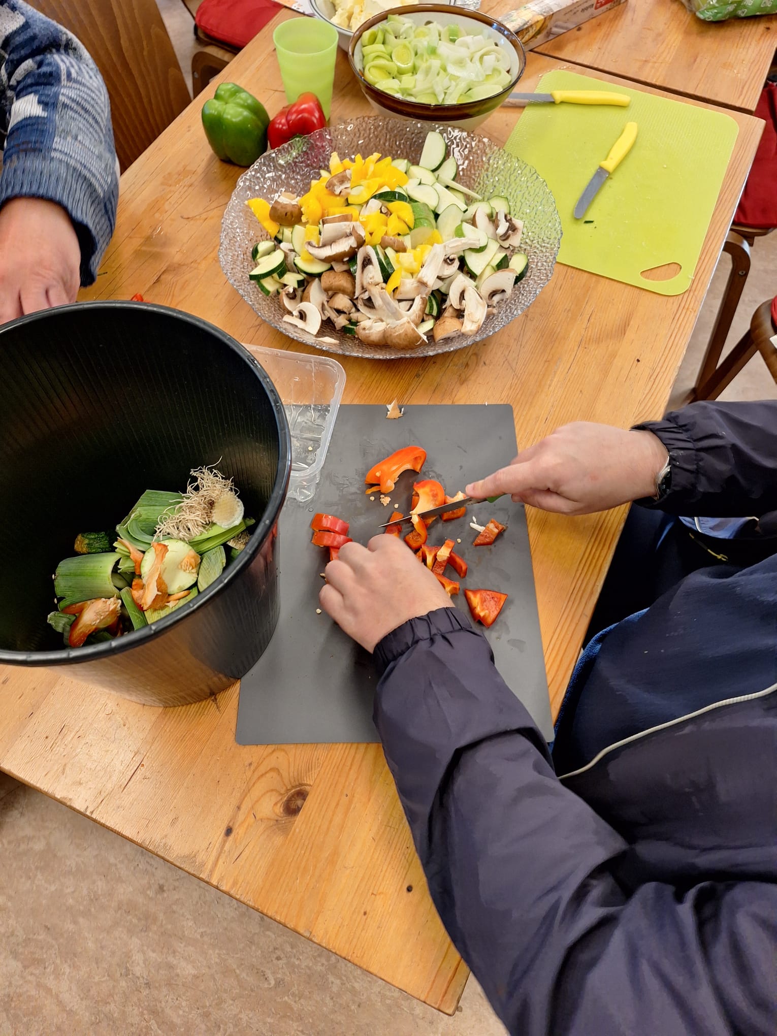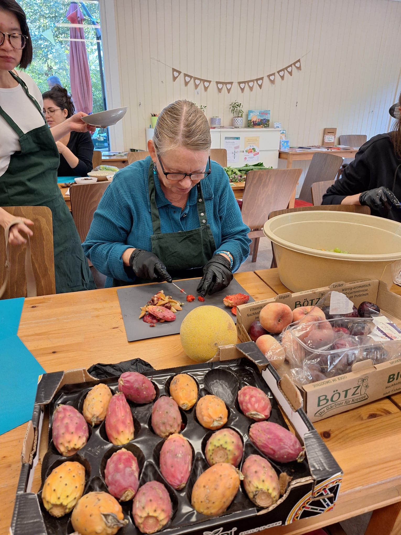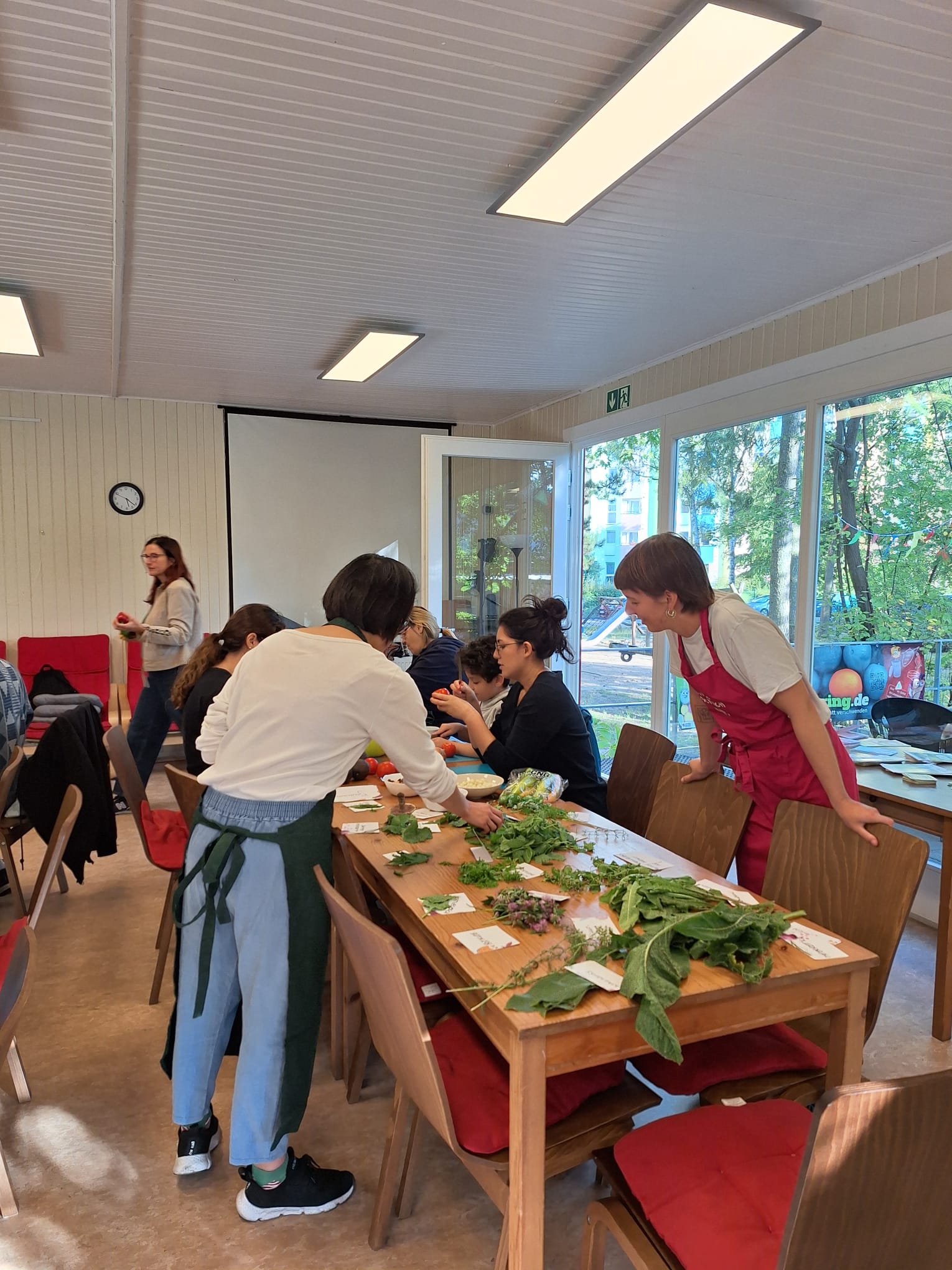 Anschließend kamen im Schwedenhaus der Paul-Gerhardt-Gemeinde viele weitere Menschen zum offenen Retter:innen-Dinner zusammen. Aus geretteten Lebensmitteln von foodsharing e.V. und gesammelten Wildkräutern wurde gemeinsam gekocht, gegessen und sich ausgetauscht.